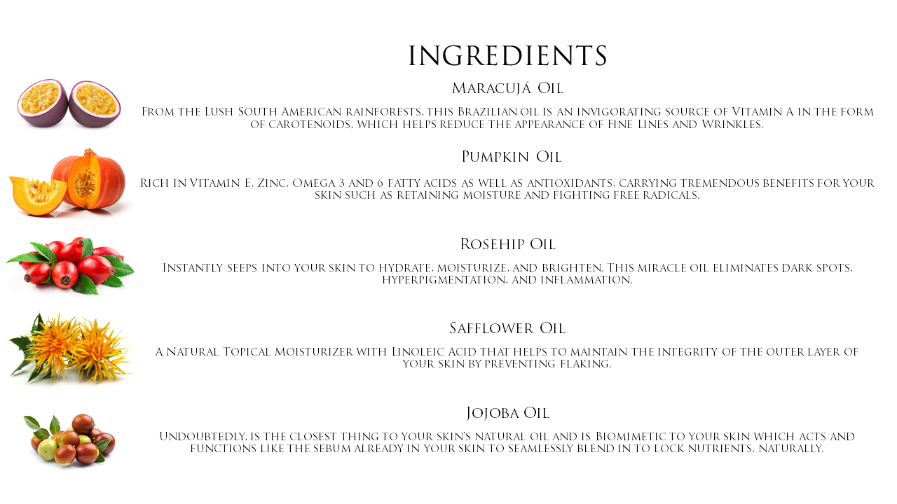 Passion Fruit (Maracujá) Oil, Pumpkin Oil, Rosehip Oil, Safflower Oil, Jojoba Oil, and Vitamin E.